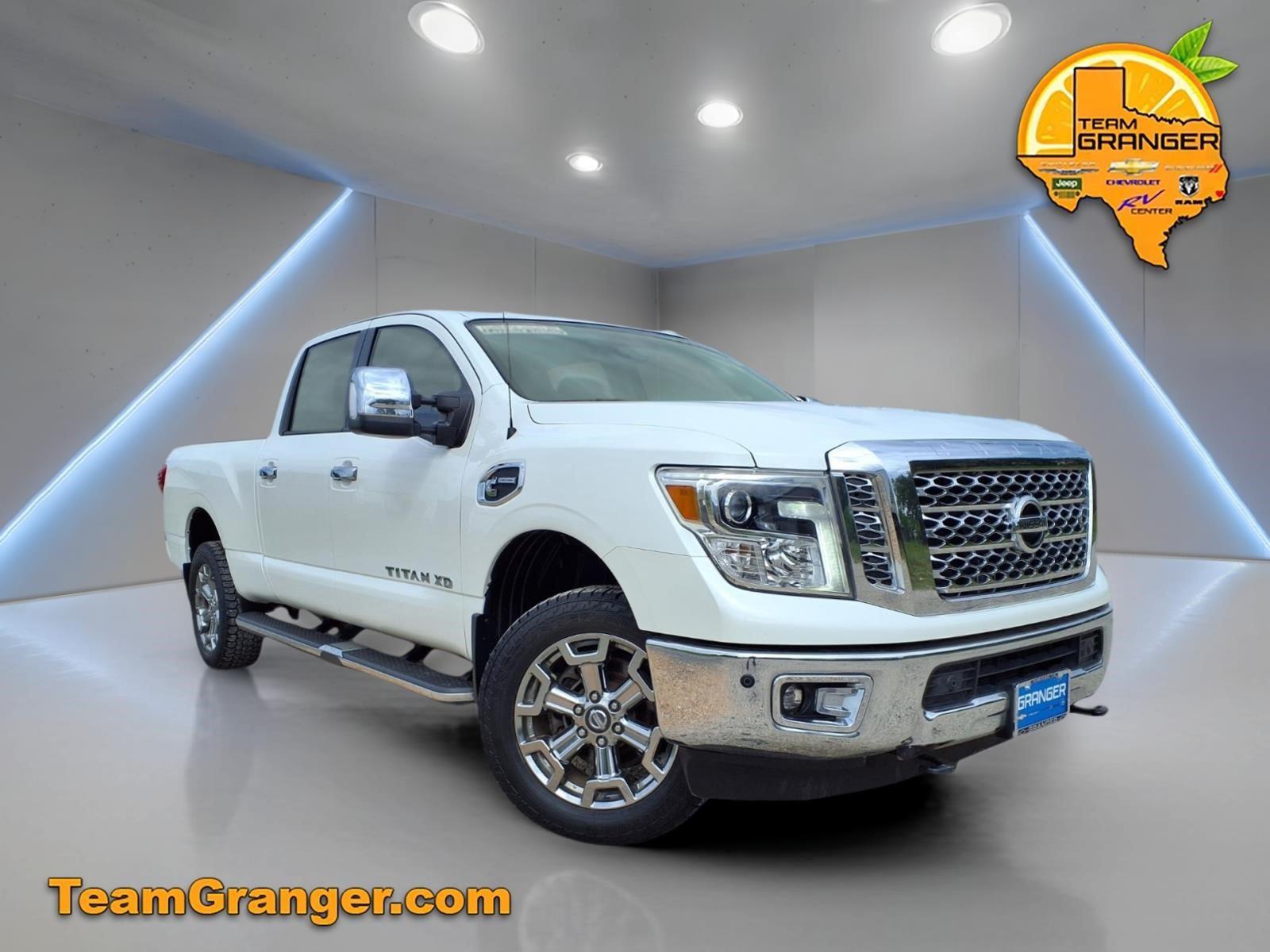 **GRANGER CERTIFIED**.Pearl White 2018 Nissan Titan XD 4D Crew Cab SL 6-Speed Automatic 4WDGranger Chevrolet is a full service Dealership proudly serving drivers near Southeast Texas, Lake Charles, and Sulphur Louisiana. We offer premium sales and financing solutions to help you craft and personalize your car buying experience. Whether you are in the market for something new or used, our diverse inventory lets you pick and choose from a plethora of affordable price points.Ask us about our SETX Exclusive Team Granger - DOWN PAYMENT ASSISTANCE PROGRAM!!!RESERVE this vehicle now with a deposit - WE SHIP VEHICLES AND TAKE TRADE-INS NATIONWIDE!!!Chrome Package (Chrome Exhaust Finisher, Chrome Grille, Metallic Kick Plates, and Wheels: 20"" x 7.5"" Chrome), 12 Speakers, 3.916 Axle Ratio, 4-Wheel Disc Brakes, ABS brakes, Air Conditioning, Alloy wheels, AM/FM radio: SiriusXM, Auto Tilt-Away Steering Wheel, Auto-Dimming Door Mirrors, Auto-Dimming Rear-View Mirror, Automatic Temperature Control, Block heater, Brake assist, Bumpers: chrome, Carpet Floor Mats, CD player, Compass, Delay-off headlights, Driver door bin, Driver vanity mirror, Dual front impact airbags, Dual front side impact airbags, Electronic Stability Control, Emergency communication system, Front anti-roll bar, Front Bucket Seats, Front Center Armrest, Front Dual Zone A/C, Front Fog Lights, Front reading lights, Front wheel independent suspension, Garage door transmitter: HomeLink, Heated Captain's Chairs, Heated Door Mirrors, Heated Front Seats, Illuminated entry, Keyless Entry, Leather Seat Trim, Leather Steering Wheel, LED Fog Lights w/Bright Chrome Bezel, Low tire pressure warning, Memory Seat, Navigation System, Outside temperature display, Overhead airbag, Overhead console, Panic alarm, Passenger door bin, Passenger vanity mirror, Power Door Mirrors, Power Driver Seat, Power passenger seat, Power steering, Power Windows, Radio data system, Radio: NissanConnect w/Navigation & Mobile Apps, Rain sensing wipers, Rear anti-roll bar, Rear seat center armrest, Rear step bumper, Rear window defroster, Rockford Fosgate Premium Audio w/12 Speakers, Security System, Speed control, Speed-Sensing Steering, Speed-Sensitive Wipers, Splash Guards (B93), Split folding rear seat, Steering Wheel Memory, Steering Wheel Mounted Audio Controls, Tachometer, Telescoping steering wheel, Tilt steering wheel, Traction control, Turn Signal Indicator Mirrors, Variably intermittent wipers, Voltmeter, and Wheels: 20"" x 7.5"" Painted Alloy.